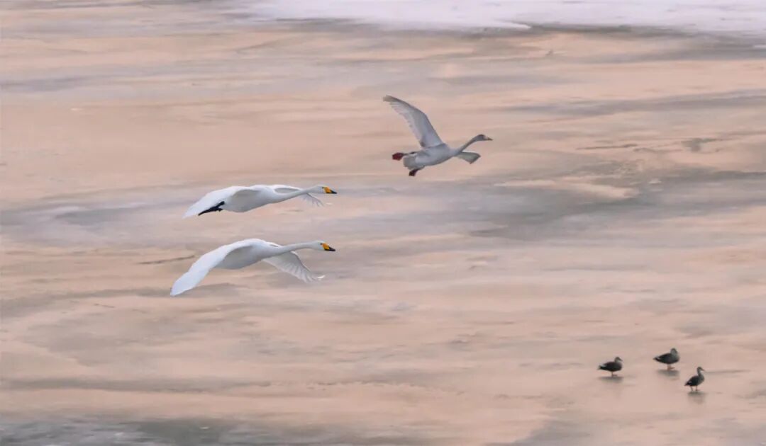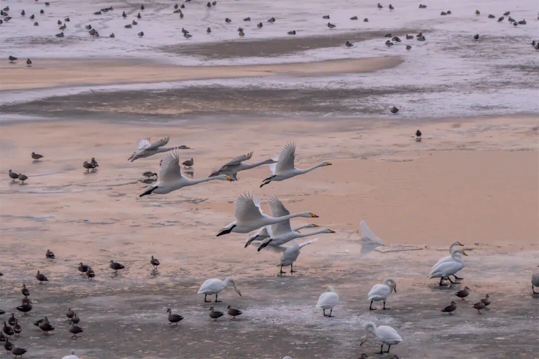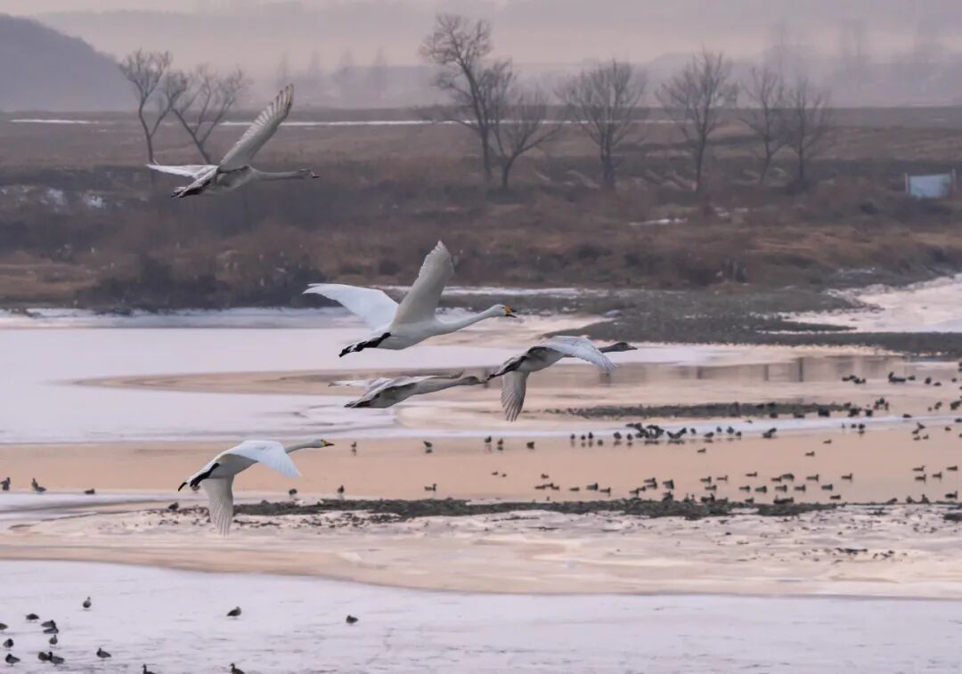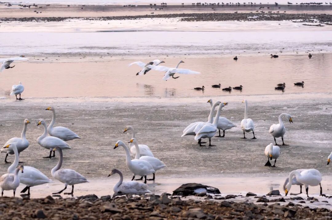 봉성시 대양하 연안, 백여마리 백조 머물며 겨울 풍경 수놓다