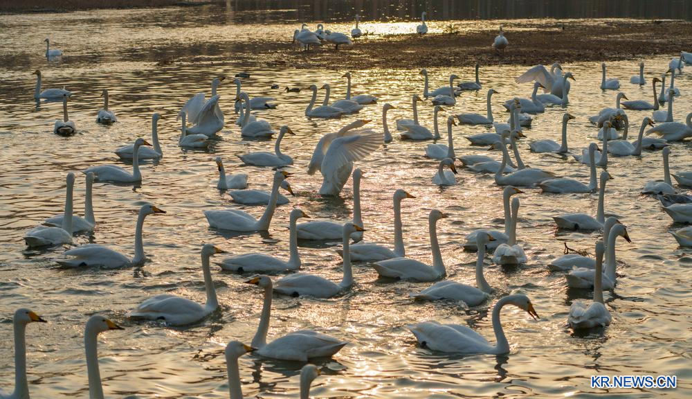 【신화통신 중국 조양 2월 27일발】 료녕성 조양시 대릉하일대에서 서식하며 겨울을 나고있는 백조를 보기 위하여 많은 사람들의 발길이 이어지고있다. 25일 조양시 북표시를 지나는 대릉하구간에서 촬영한 백조떼.