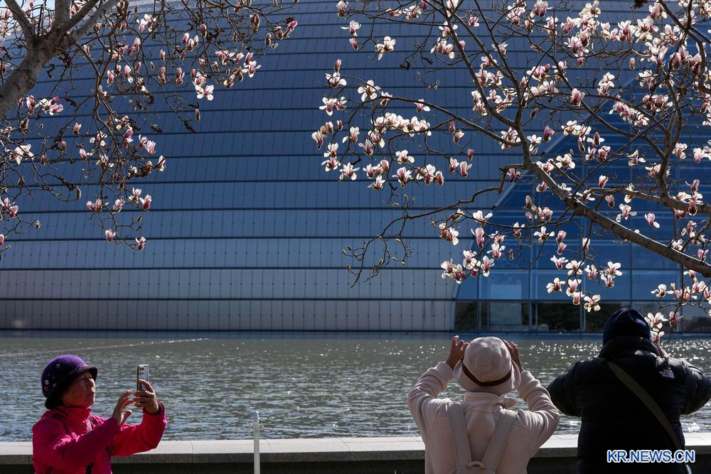 관광객이 9일 중국 국가대극원 옆에서 만개한 목련을 카메라에 담고 있다.
