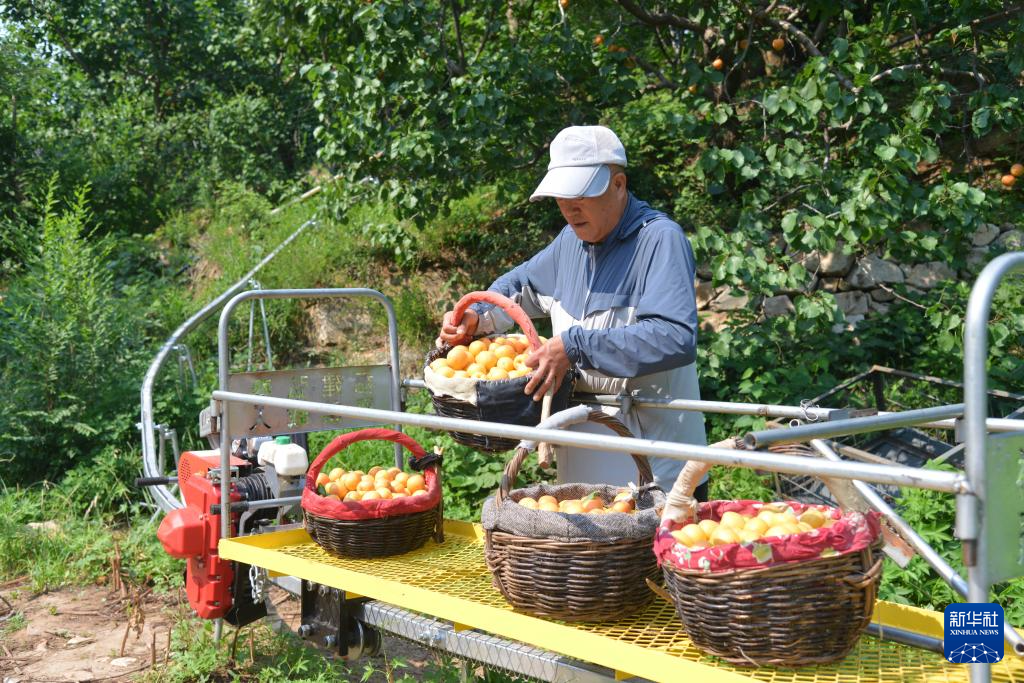 6月24日,在北京市平谷区南独乐河镇北寨村,果农通过单轨运输车将摘好的红杏运送下山。