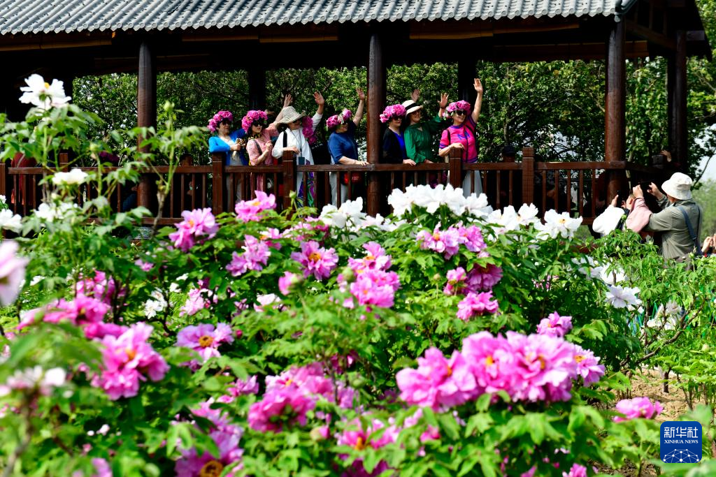 4月8日,在菏泽市曹州牡丹园,盛开的牡丹吸引游客驻足欣赏。