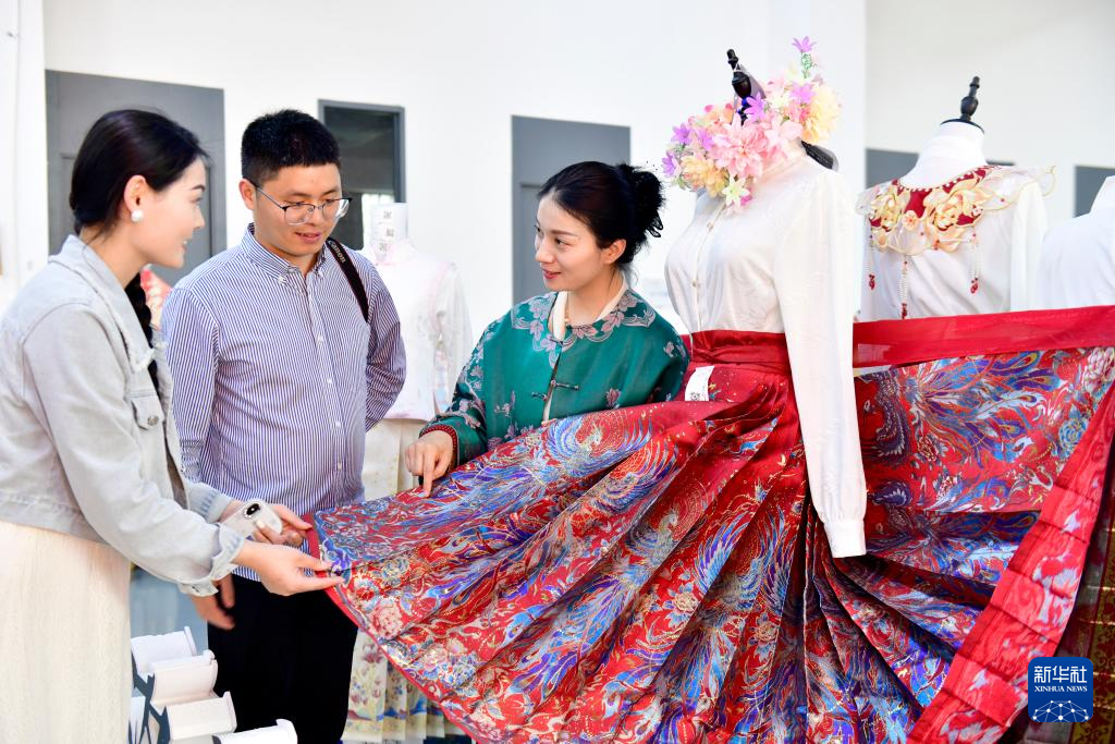 菏泽市曹县有爱云仓汉服基地负责人姚驰行(右)向参观者介绍马面裙(4月10日摄)。