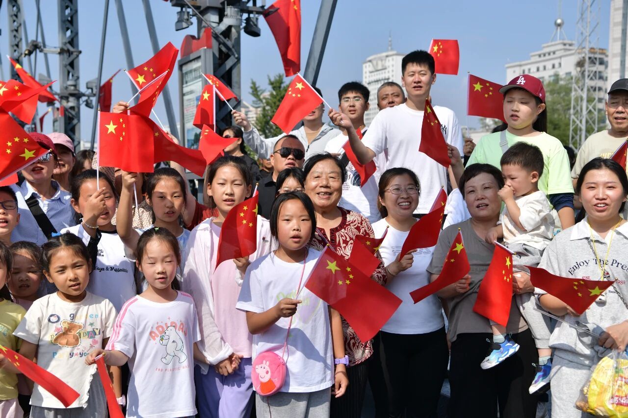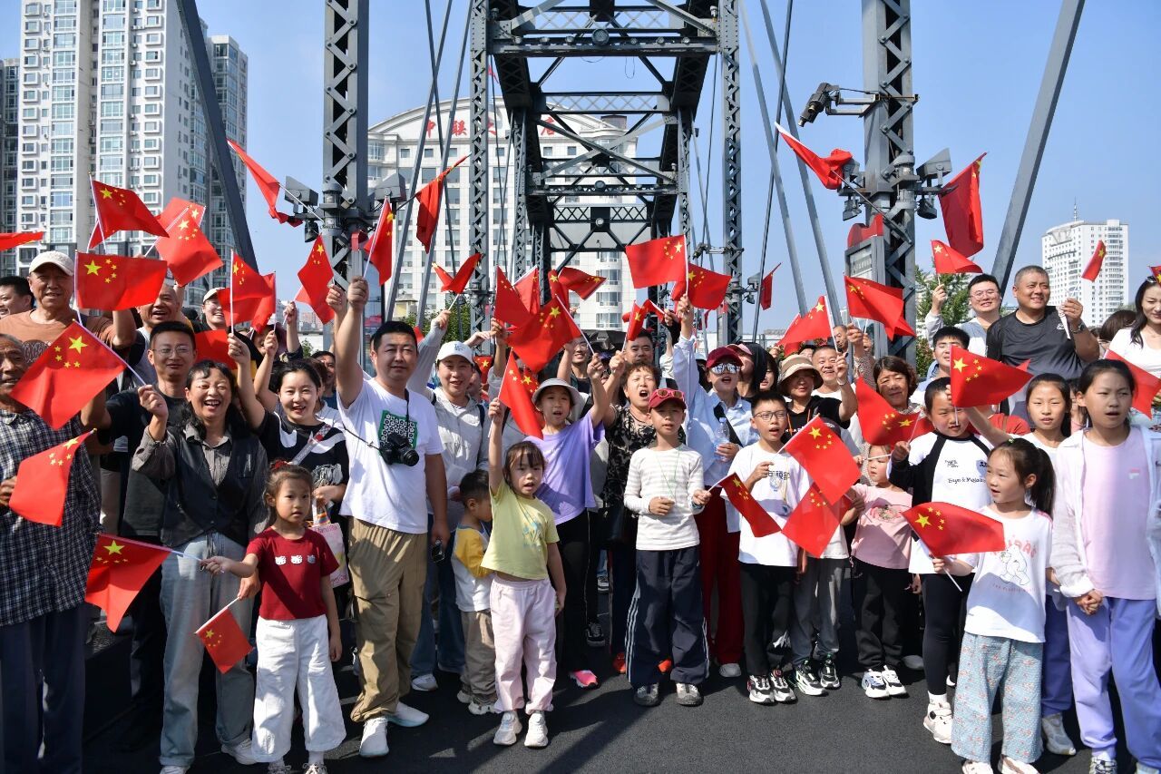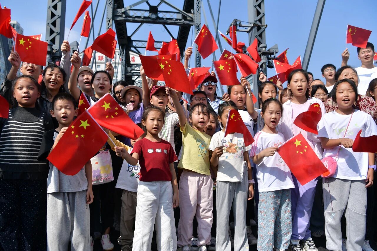现场气氛热烈而感人。挥舞的五星红旗汇聚成红色风景,白发苍苍的老者与朝气蓬勃的青年并肩而立,父母抱着孩子参与其中,每个人的脸上都洋溢着自豪与激动。歌声愈发响亮,情感愈发澎湃,雄壮的旋律回荡在鸭绿江上,与历经战火洗礼的鸭绿江断桥形成跨越时空的对话,历史与当下在此刻紧密交融。