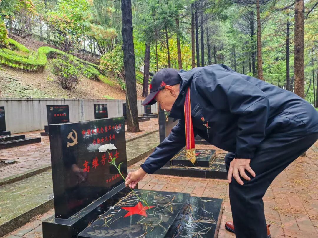 在丹东市抗美援朝烈士陵园,何伯渠老人在家人的搀扶下向陵园纪念碑鞠躬并献上鲜花。陵园内,安葬着志愿军第15军高维芳、李培荷两位战友。何伯渠老人为两位共同作战的牺牲战友献上鲜花,还为两位战友清扫墓碑。他动情地说:“战友们,你们的血没白流,现在国家富强了,后人享福了。”