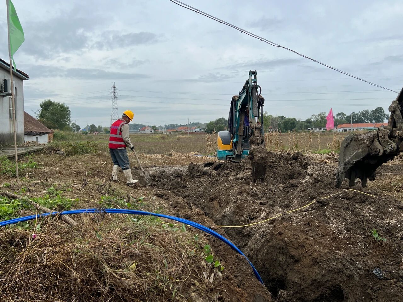 近日,在东港市椅圈镇农村饮水安全巩固提升四期工程(吴家村管网段)施工现场,工人们正在忙着铺设输水管道,打造全新的供水管网。