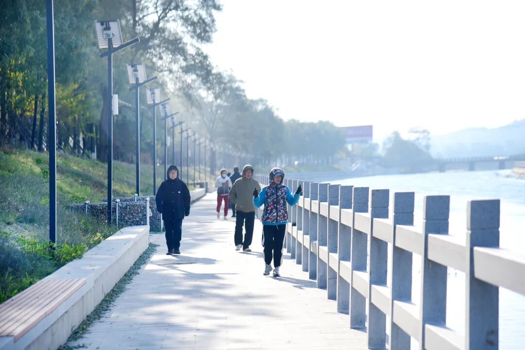 初冬的清晨,在振安区五龙背镇段大沙河,不少居民沿河岸步道散步健身。阳光洒在波光粼粼的水面上,像一条银色丝带穿镇而过,呈现出水清、岸绿、景美的生态河道景观。