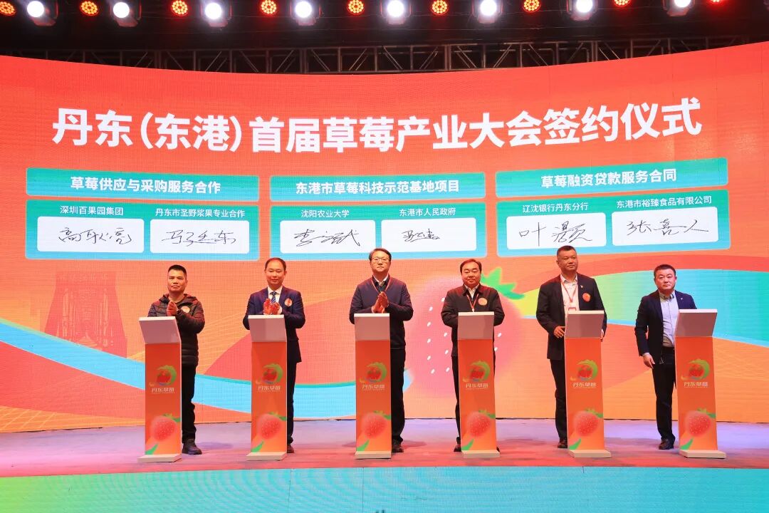在签约仪式上,辽宁省农科院与东港市政府,江苏省泰州市姜堰区蒋垛镇政府与东港市椅圈镇政府,顺丰速运(沈阳)有限公司与丹东玖玖农业有限公司,沈阳农业大学与东港市政府,深圳百果园集团与丹东市圣野浆果专业合作社,辽沈银行丹东分行与东港市裕臻食品有限公司,围绕产学研合作、区域联动、产销对接、金融支持等关键领域达成多项战略合作,共绘丹东草莓产业振兴新蓝图。