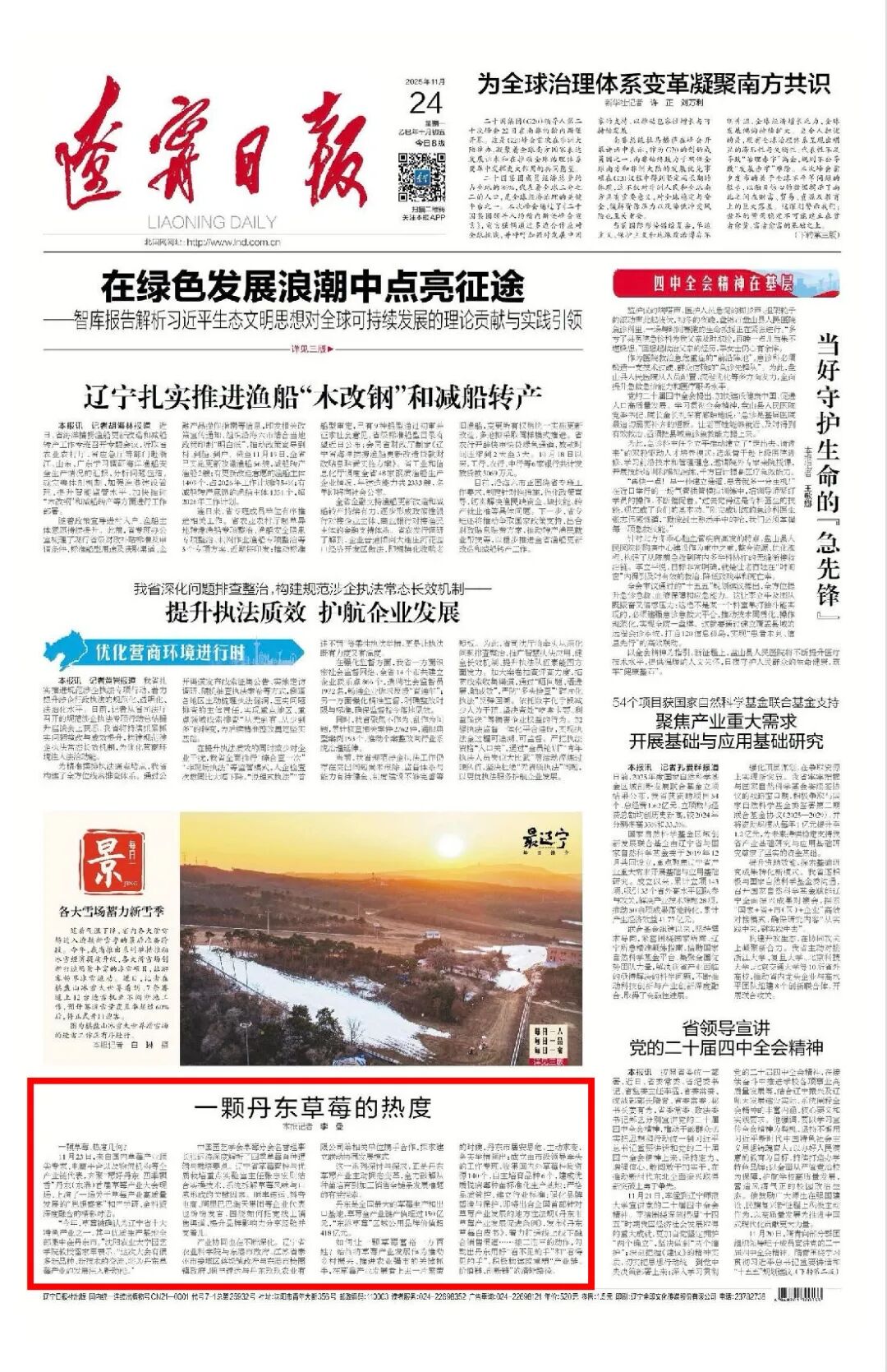 11月24日,《辽宁日报》在头版刊文《一颗草莓的热度》,对丹东草莓进行了报道。