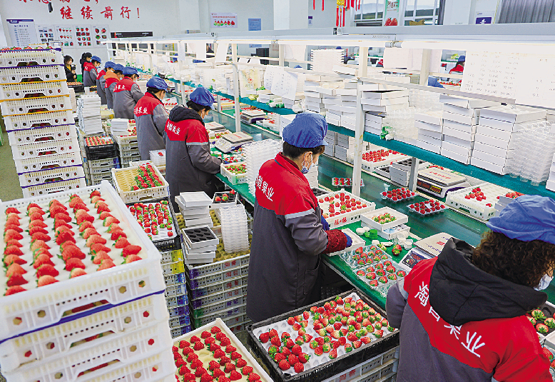 车间内,机器运转声与工人协作的脚步声交织,一派忙碌景象。数十名分拣工人身着统一工作服,手指翻飞间,将刚从基地运来的草莓按照大小、色泽、饱满度精准分级。每一颗草莓都要经过人工筛选,有瑕疵、个头不达标的都会被剔除。经过筛选的优质草莓,被工人们熟练地装入定制包装盒,随即通过传送带送往包装环节,覆膜、封箱一气呵成,动作连贯流畅。