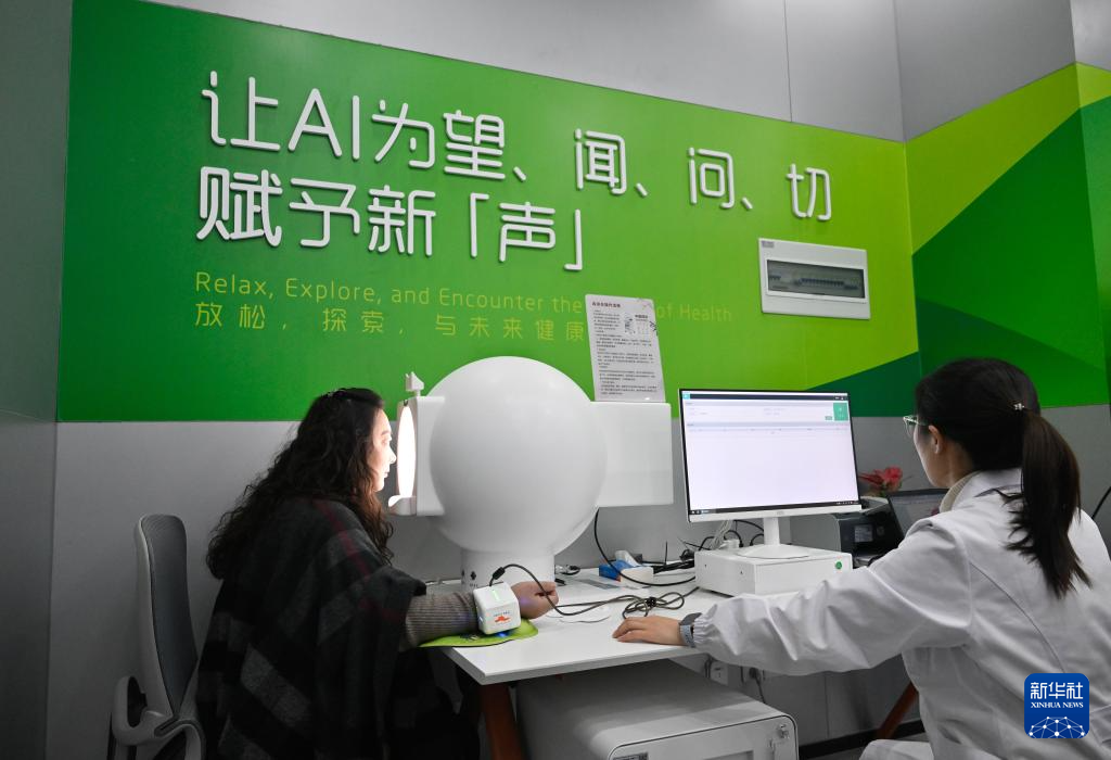 12月4日,在“AI·镜界—南京人工智能生态街区”,一位女士在“AI诊所”进行健康检测。(新华社记者 季春鹏 摄)