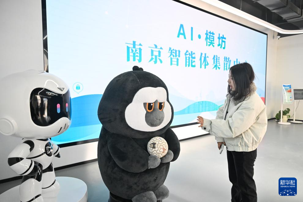 12月4日,在南京人工智能生态街区的“AI·模坊”南京智能体集散中心,一款华夏机器人在打招呼。(新华社记者 季春鹏 摄)