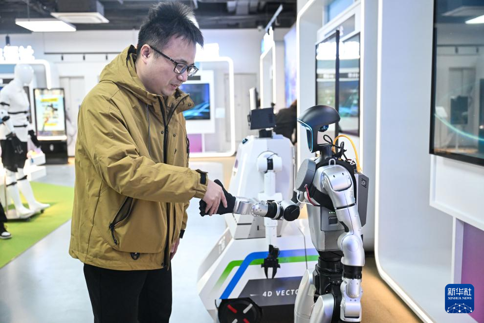12月4日,在南京人工智能生态街区的“AI·模坊”南京智能体集散中心,工作人员与机器人握手。(新华社记者 季春鹏 摄)