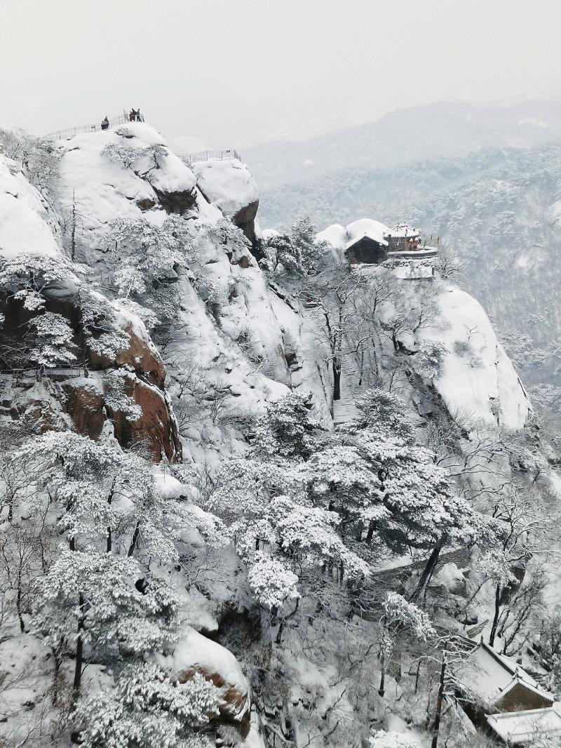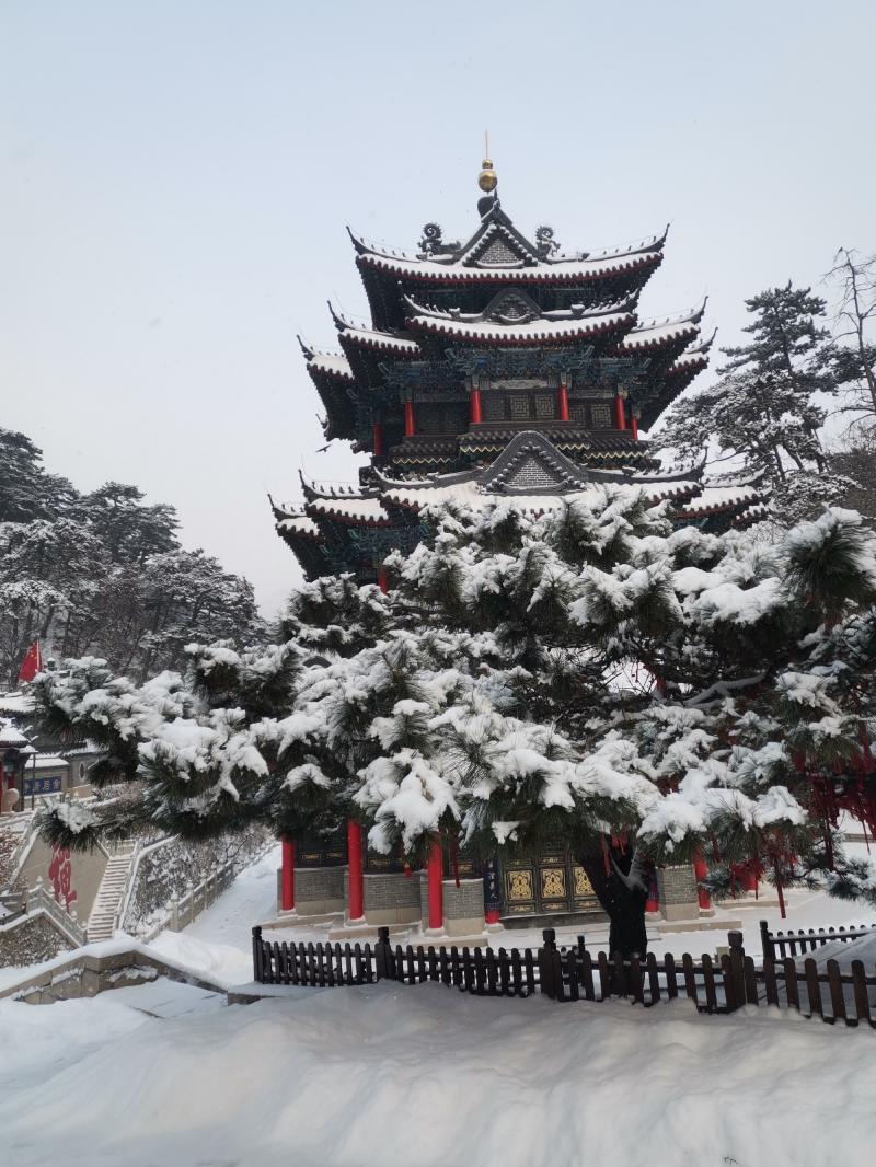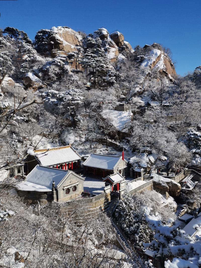 雪后的千山,连绵山脉被皑皑瑞雪覆盖,红门、灰墙与白雪相互映衬,增添了几分古朴而神秘的气息。