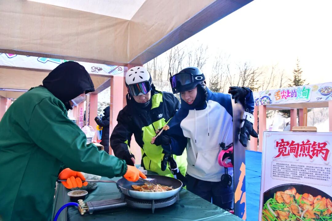滑雪大厅外的“地道宽甸味”美食市集香气扑鼻,铁锅炖、煎锅、酸汤子等特色美食现场制作,浓浓东北冬日烟火气。