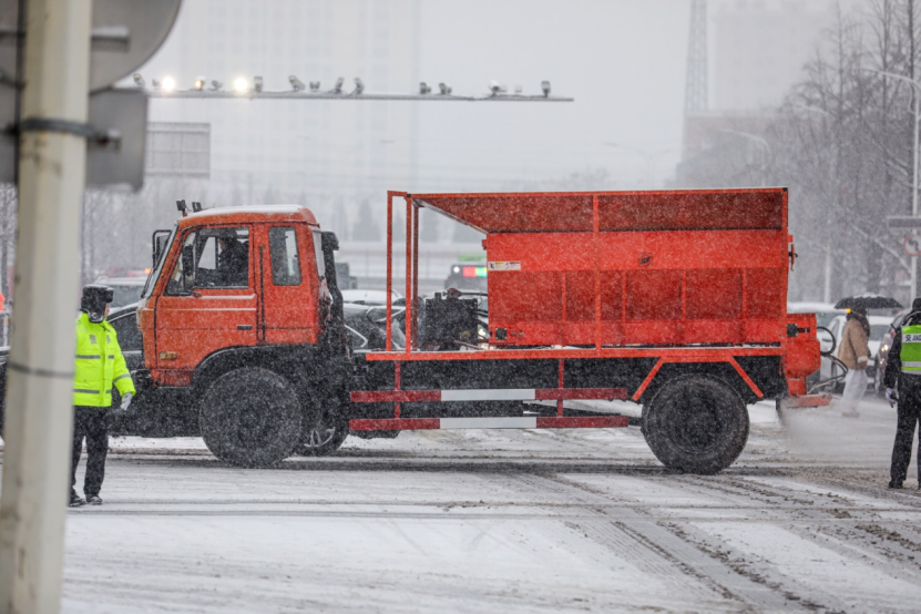在十纬路、六纬路等主要道路,市政部门对道路布撒除雪剂,并进行除雪作业。