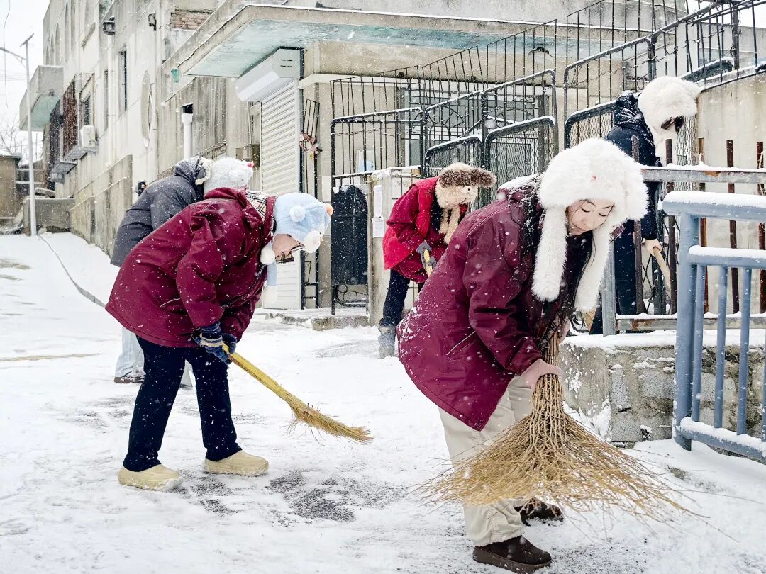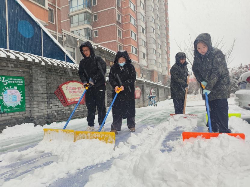 振兴区纤维街道黄海社区迅速组织工作人员、志愿者及居民开展扫雪除冰作业。