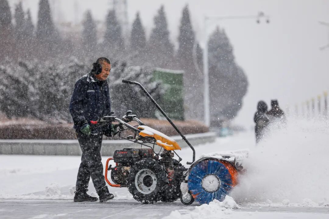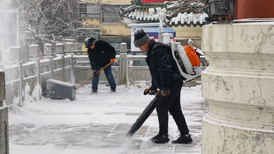 除使用扫帚、铁锹进行清扫外,还调配小型除雪设备,力求在最短时间内清除积雪积冰,最大限度减少降雪对市民游园的影响。