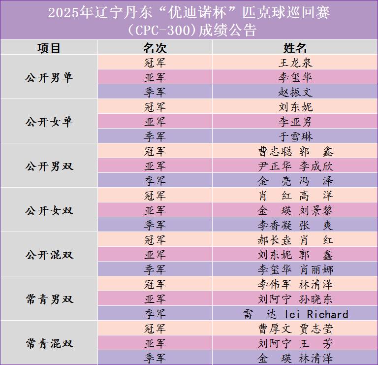 以“优迪诺杯”CPC-300的成功举办为缩影,丹东正通过持续打造品牌赛事、优化办赛环境、深化体旅融合,不断擦亮“匹克球之城”的金字招牌。每一次挥拍,不仅点燃了运动热情,更向世界发出邀请,欢迎来到丹东,体验这座城市的运动活力、自然之美与人文之韵。
