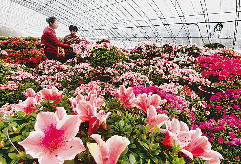 变电村有着28年的杜鹃花种植历史,凭借肥沃的土壤、适宜的水质,加之独特的气候条件,孕育出的盆景杜鹃品质上乘,让“全国杜鹃看丹东,丹东杜鹃看变电”广为流传。依托这一优势,村里不断创新服务模式,将科技赋能与助农纾困深度融合,积极引导村民扩大种植规模,如今已建成230栋杜鹃花温室大棚,栽植面积达500余亩,形成了规模化、集约化的产业集群。