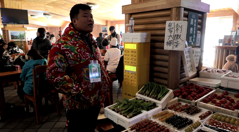 购物需求也被精准满足。雪场休闲区三楼开辟免费摊位,向周边村民开放。双山子镇平坨村村民张士明每天清晨现摘草莓摆摊:“大的40元一斤,35元一斤的、30元一斤的也有,都是给滑雪游客准备的。一天能卖五六十斤,收入2000多元,比种地强多了。”