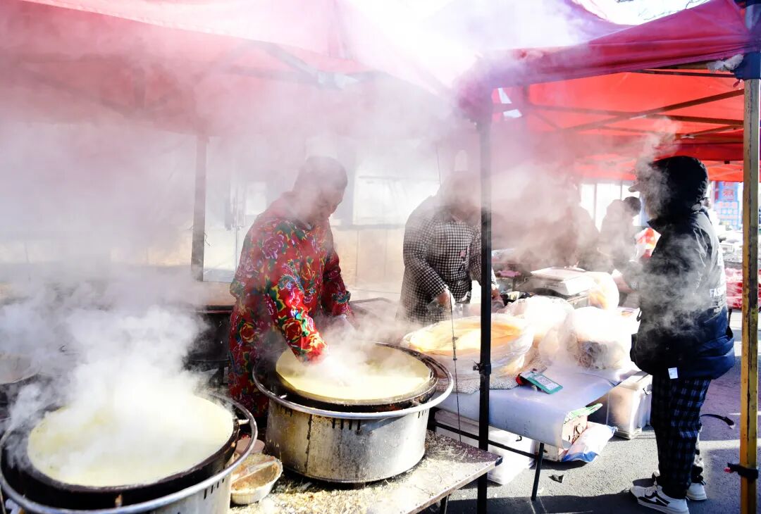 鸡冠子鲜红的跑山鸡、油锅里翻滚的麻团儿、现摊的玉米面煎饼、各类东北大花袄……从肉蛋熟食到生活用品,从五金杂货到服装鞋帽,琳琅满目,一应俱全,分分钟一站式备齐年货。