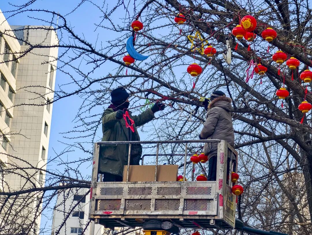 寒风中,红彤彤的灯笼经工作人员之手,依次“绽放”在银杏枝头,将冬日的萧瑟驱散,把新春的暖意传递。