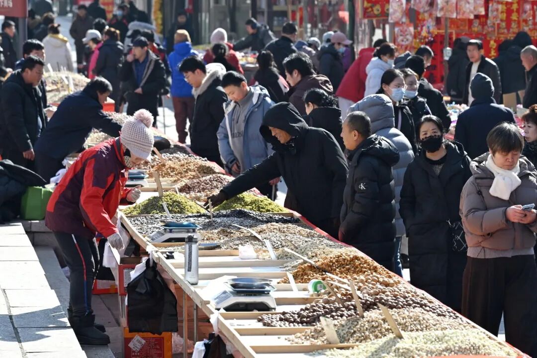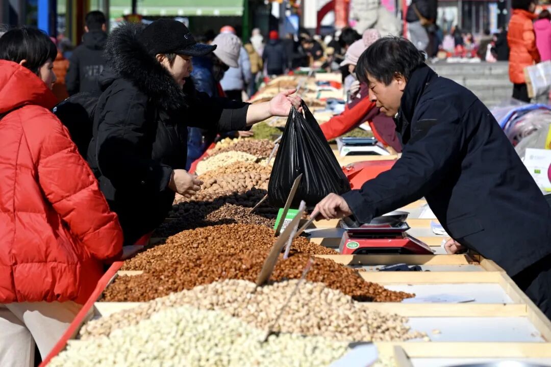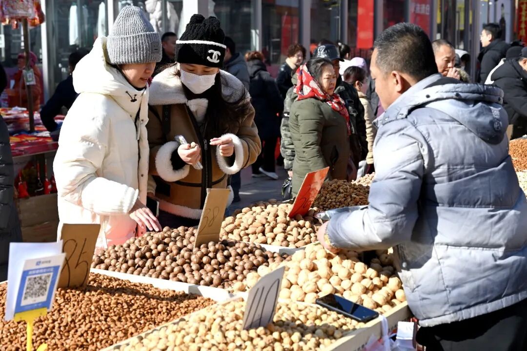此时的新安步行街变成了年货集市,在干果摊前,人们围得水泄不通,开心果、巴旦木、腰果等干果堆成了小山,大家一边挑选,一边品尝,欢声笑语回荡在集市的上空。