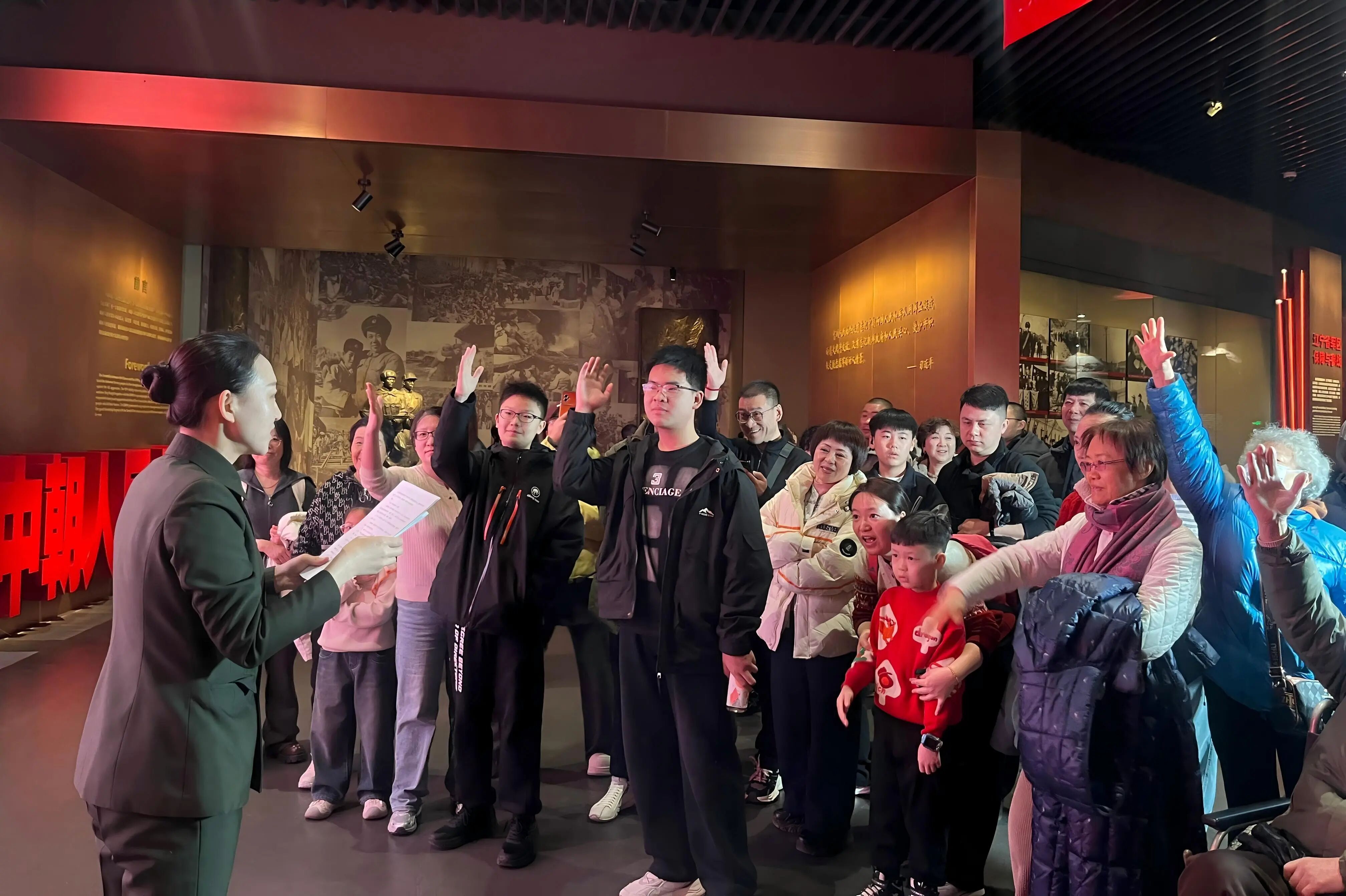 随着客流高峰的到来,讲解员们开启了“连轴转”模式。“今天开馆仅两个多小时,我们就已经为100多个家庭提供了讲解服务。”抗美援朝纪念馆社会教育部负责人介绍,从正月初二开始,参观人数就一直呈上升趋势。