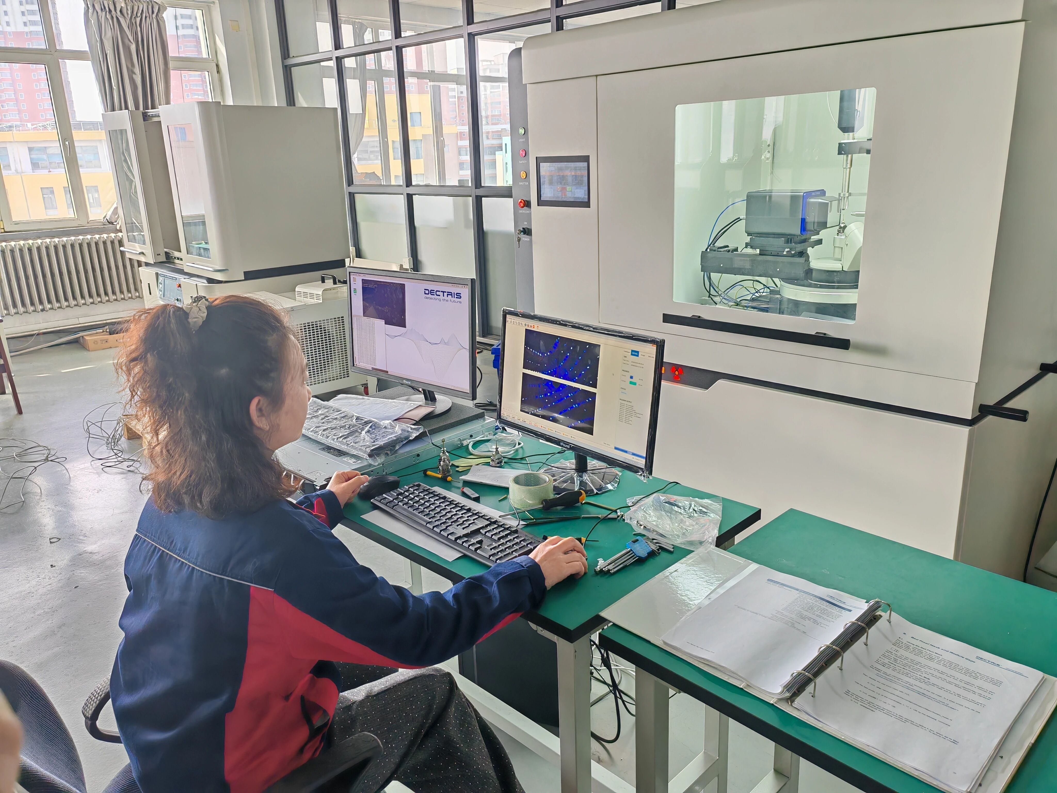 在丹东通达科技有限公司,质检中心内的9台光源射线产品,正在电脑后台的控制下,全自动采集测试产品数据,这些产品3月份将发往安徽的客户。在公司调试中心,工作人员正在对“桌面衍射仪”产品做出厂前的最后调试。