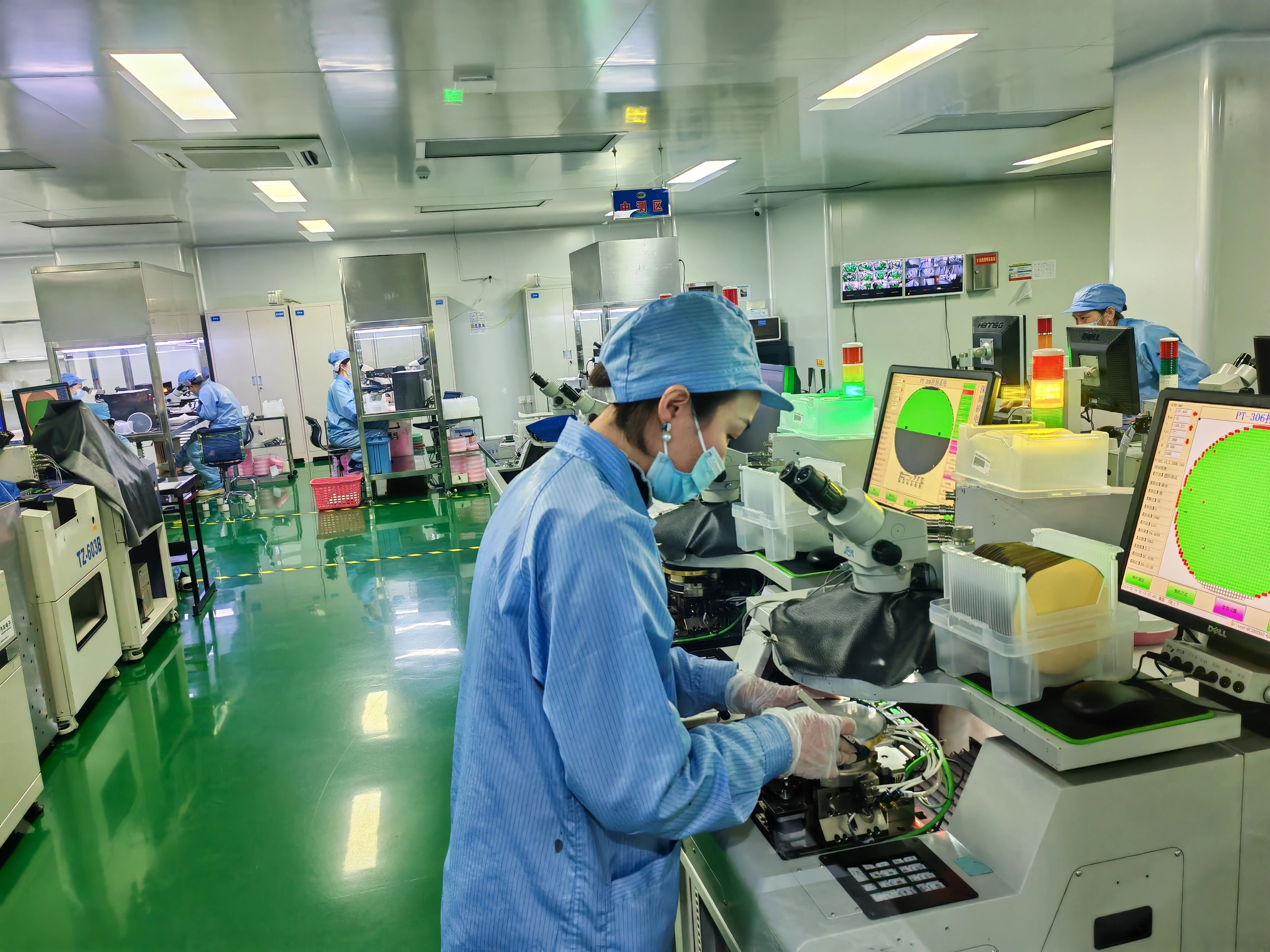 同样忙碌的还有丹东安顺微电子有限公司,该公司是主要研发晶体管芯片和集成电路制造的专精特新企业。透过公司测试车间的落地玻璃窗,记者看到,电脑荧屏闪烁,身着净化服的工作人员正在操作检测仪对产品芯片进行检测。