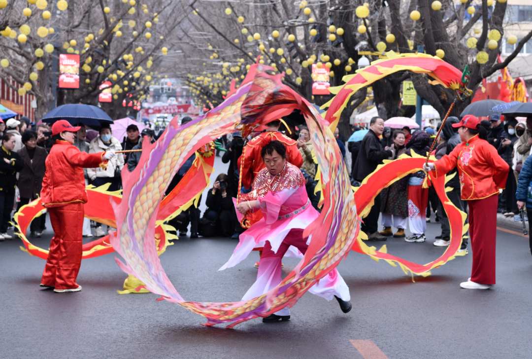 文艺汇演结束后,秧歌展演队伍身着盛装从杜鹃广场出发,沿着九纬路踏歌而行。铿锵锣鼓、灵动舞姿吸引市民游客驻足观看、拍照互动。“在家门口的百年街区看秧歌、闹元宵,氛围感直接拉满。”和家人同来的市民刘女士笑着说。