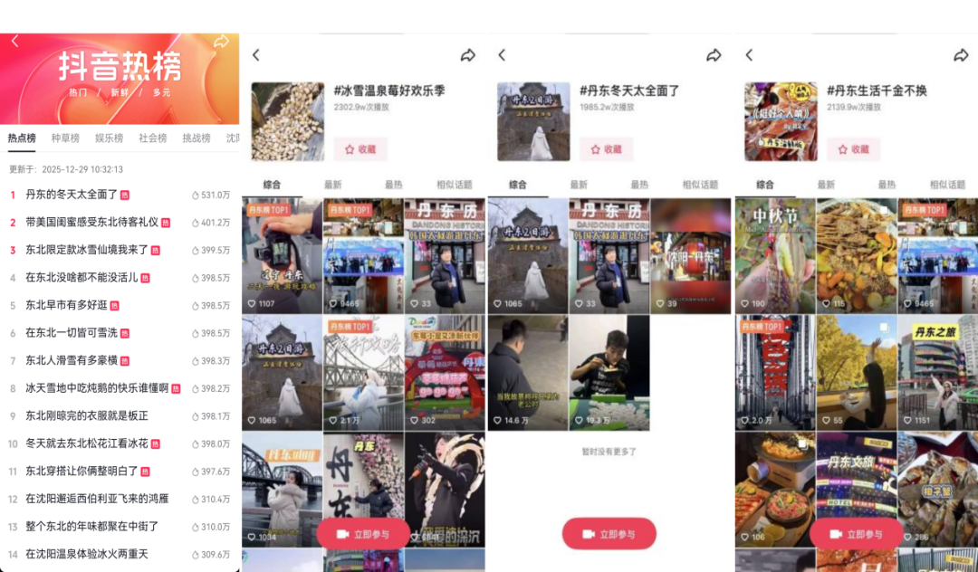 “冰雪温泉莓好欢乐季 ”、“丹东生活金不换” 等核心话题,全网播放量超6600万。“丹东的冬天太全面了” 热点话题,一经推出便冲上丹东抖音热榜前三,经持续的作品发布与内容发酵,多日蝉联丹东地区榜一、二位。