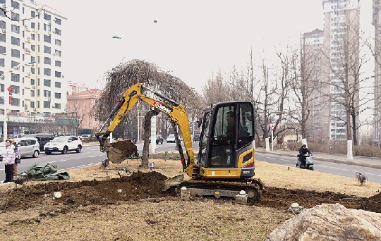 图为近日,在山上街与表厂路交会处,工作人员利用机械对裸露空地进行深度翻耕。