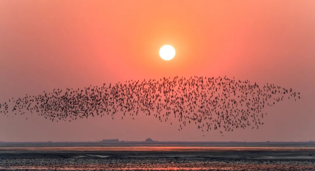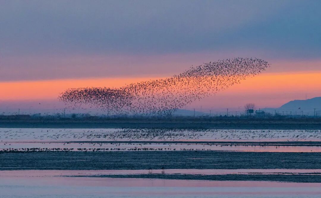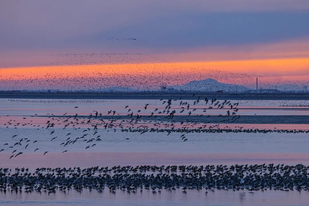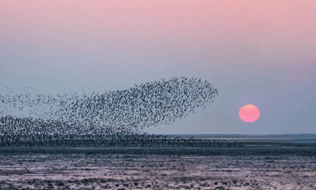 万鸟翔集的鸟浪景观形成与潮汐规律密不可分。潮水上涨会将分散在广阔滩涂上觅食的鸟群驱赶到近岸的狭长地带,使其高度集中,从而形成密集飞行的奇观。