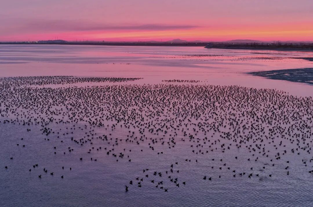 鸭绿江口湿地再现金辉映鸟浪奇观