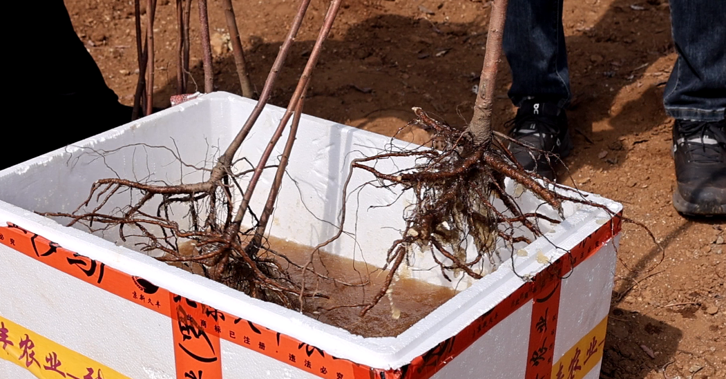 为提高苗木成活率,园林技术人员在栽植前对所有树苗统一进行“蘸根”处理——将根系浸泡于由保湿剂与植物生长调节剂配制而成的混合溶液中,有效锁住水分、促进根系发育,为苗木在干旱山地环境中扎根生长提供关键保障。