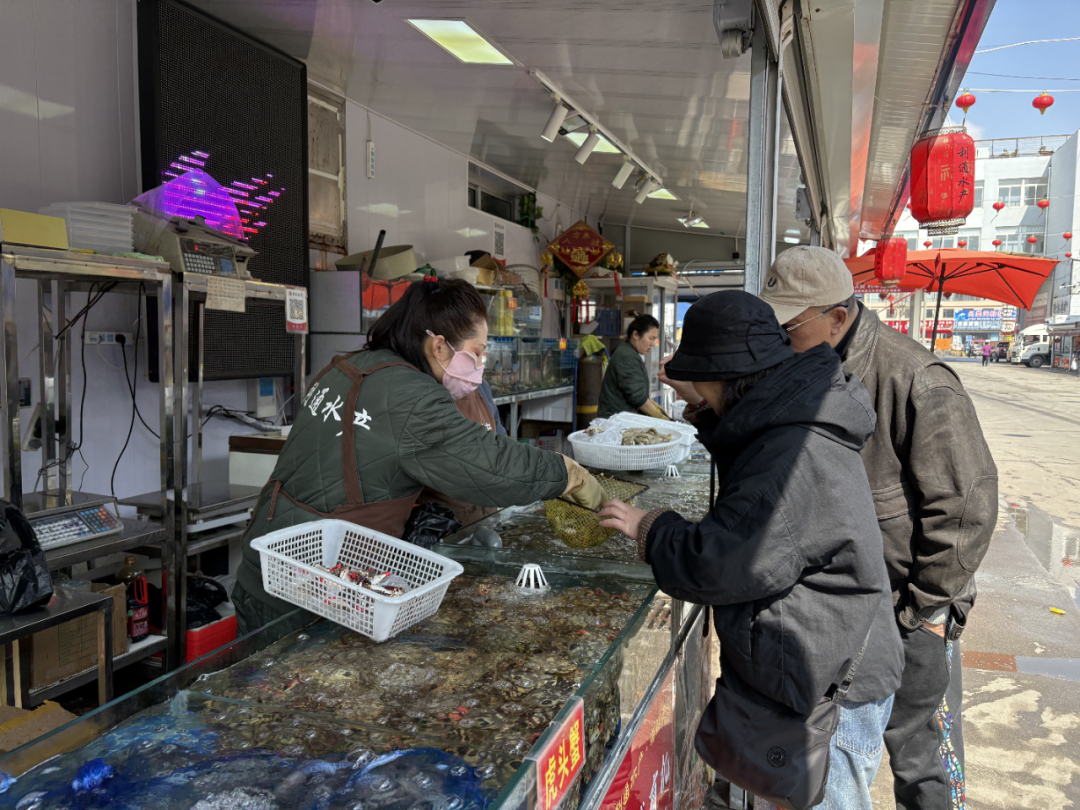“时令海鲜主要有黄蚬子、虾爬子、梭子蟹,还有野生小石蛎子,现在正是吃虾爬子、母蟹的时候。”说话间,市场商户孙国轩拿起一只梭子蟹,“你看,这都是‘三点红’,满黄。”