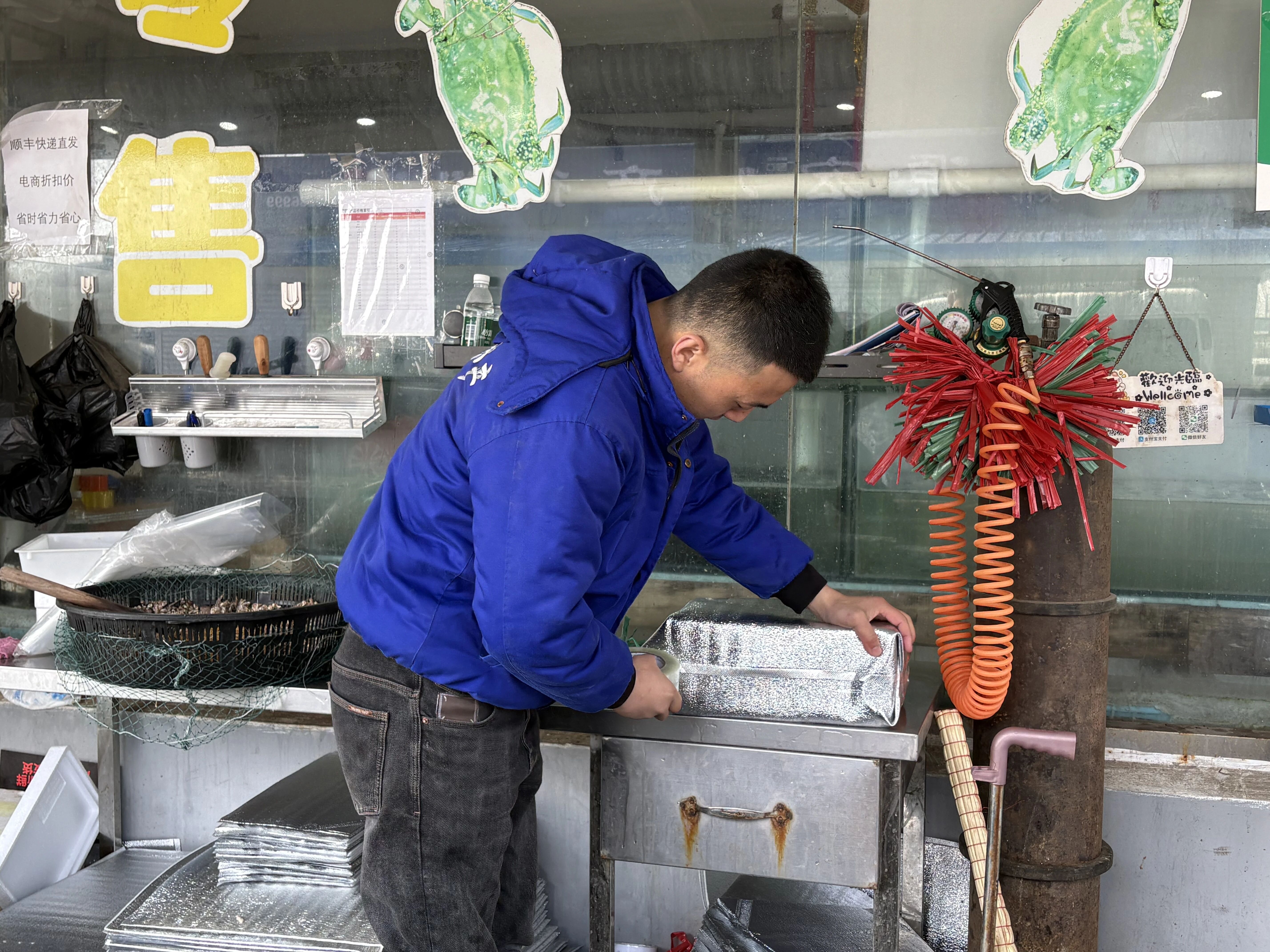 记者在孙国轩的摊位上看到,各类海鲜一应俱全,店内五六个人忙得不亦乐乎,有的招待摊位上的顾客,有的与线上顾客沟通,有的打包发货。“我们的海鲜发往广州、深圳、上海等很多城市,还有新疆的顾客,他们都是来这儿买过海鲜,加了联系方式,回去后不断回购的。”孙国轩介绍。