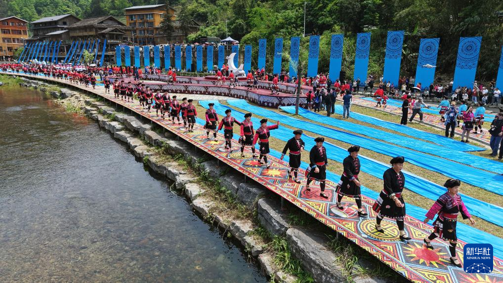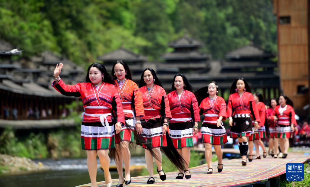 4月19日,在广西桂林市龙胜各族自治县龙脊镇金江村黄洛瑶寨,当地群众参加“T台秀”。(无人机照片/韦吉阳 摄)
