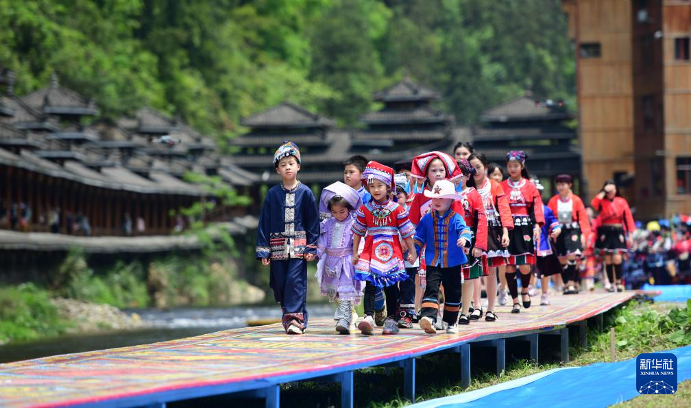 4月19日,在广西桂林市龙胜各族自治县龙脊镇金江村黄洛瑶寨,小朋友身着民族服装参加“T台秀”。(潘志祥 摄)