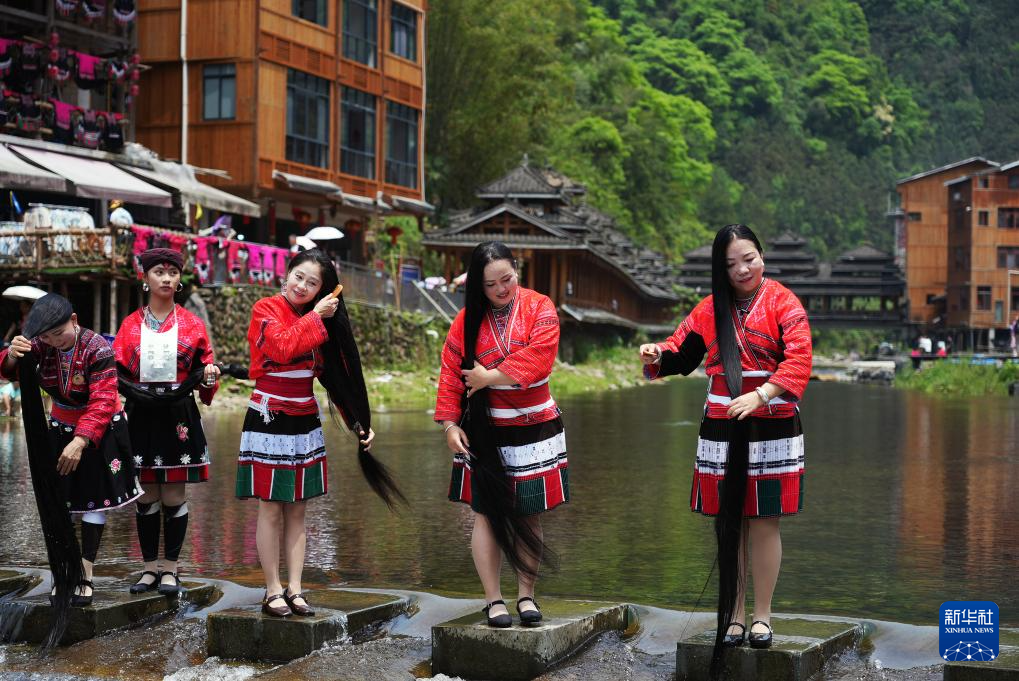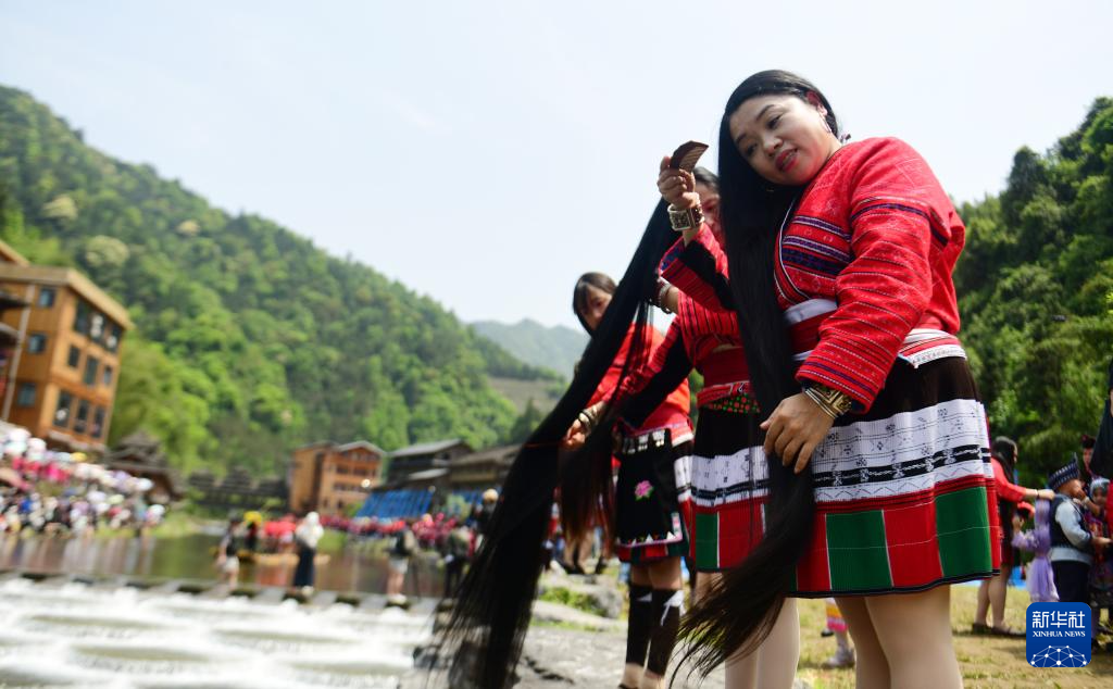 4月19日,在广西桂林市龙胜各族自治县龙脊镇金江村黄洛瑶寨,瑶族妇女在河边展示长发梳妆。(韦吉阳 摄)