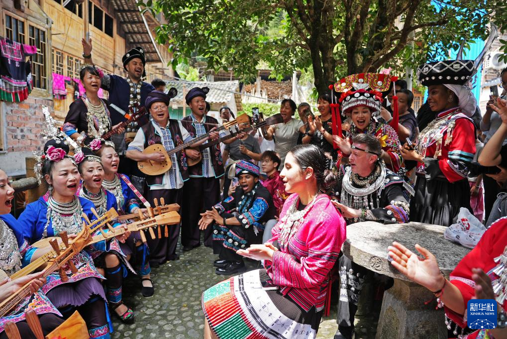 4月19日,在广西桂林市龙胜各族自治县龙脊镇金江村黄洛瑶寨,当地群众和外国友人对山歌。(韦吉阳 摄)