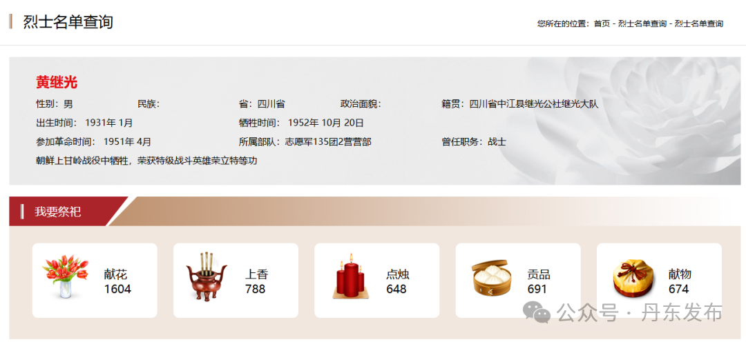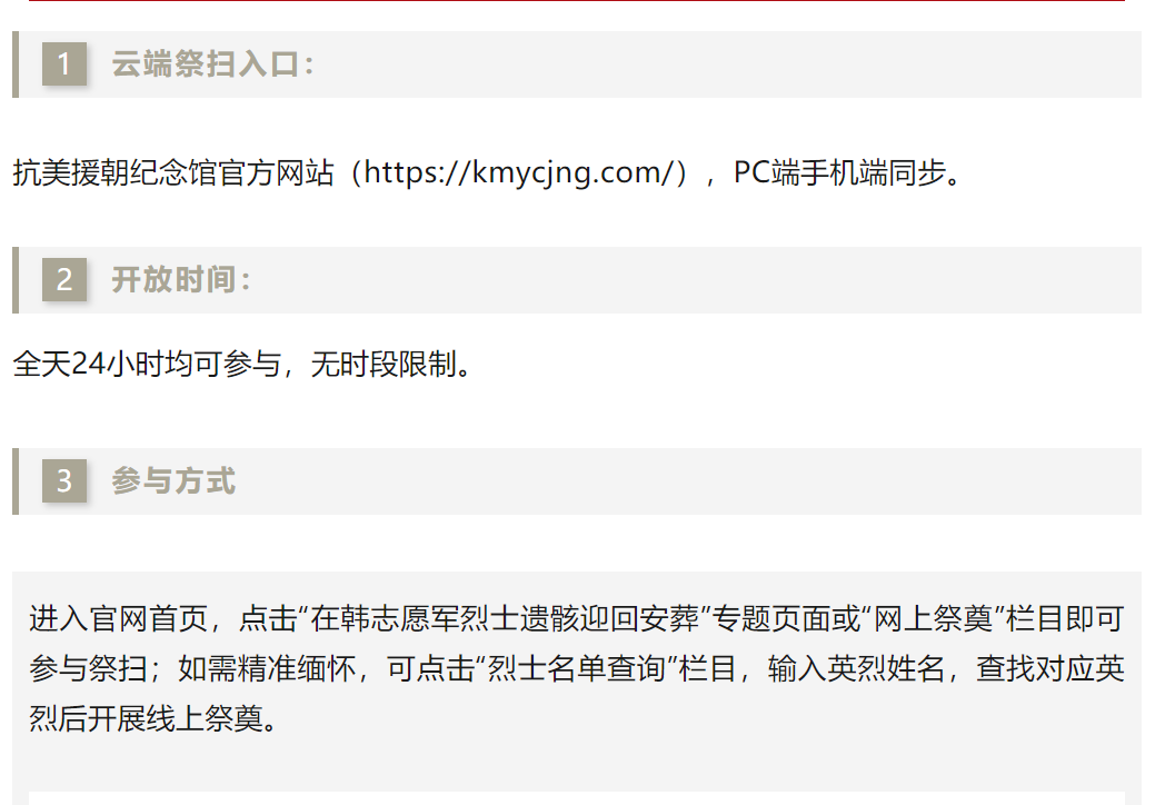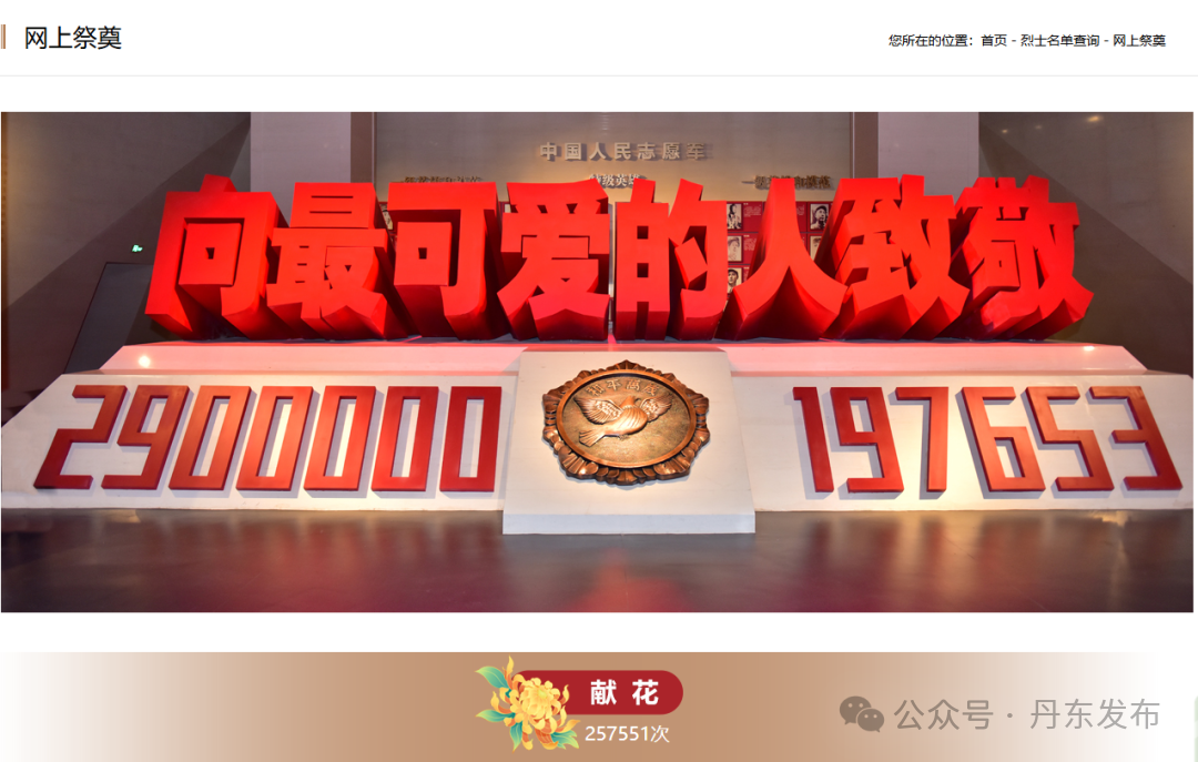 此次云端祭扫依托抗美援朝纪念馆官方网站,进入官网首页就可以在显著位置看到“在韩志愿军烈士遗骸迎回安葬”专题页面。大家可直接点击专题页面中的“点击进入”,为中国人民志愿军英烈敬献鲜花、抒发追思;也可以通过首页“网上祭奠”栏目进入,或者点击“烈士名单查询”板块,输入英烈姓名,精准查找对应英烈信息,进行线上献花、点烛祭祀,以简约肃穆的形式,向为了祖国、为了人民、为了和平献出宝贵生命的志愿军烈士致以崇高敬意。