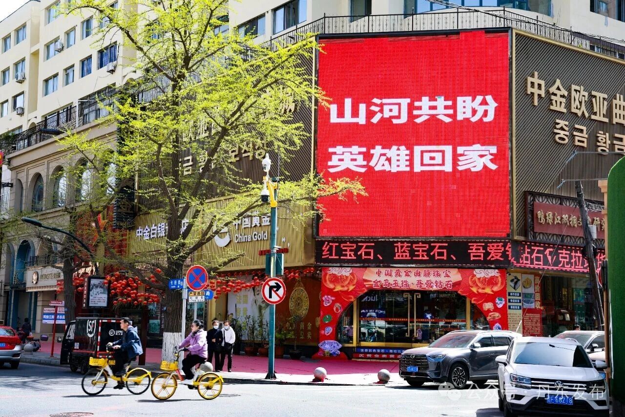 鸭绿江畔、商圈景区等重点区域的户外电子大屏同步播放主题画面,诉说着整座城市的思念与崇敬,彰显了英雄城市矢志不渝的忠诚与守望,引得市民驻足凝望。