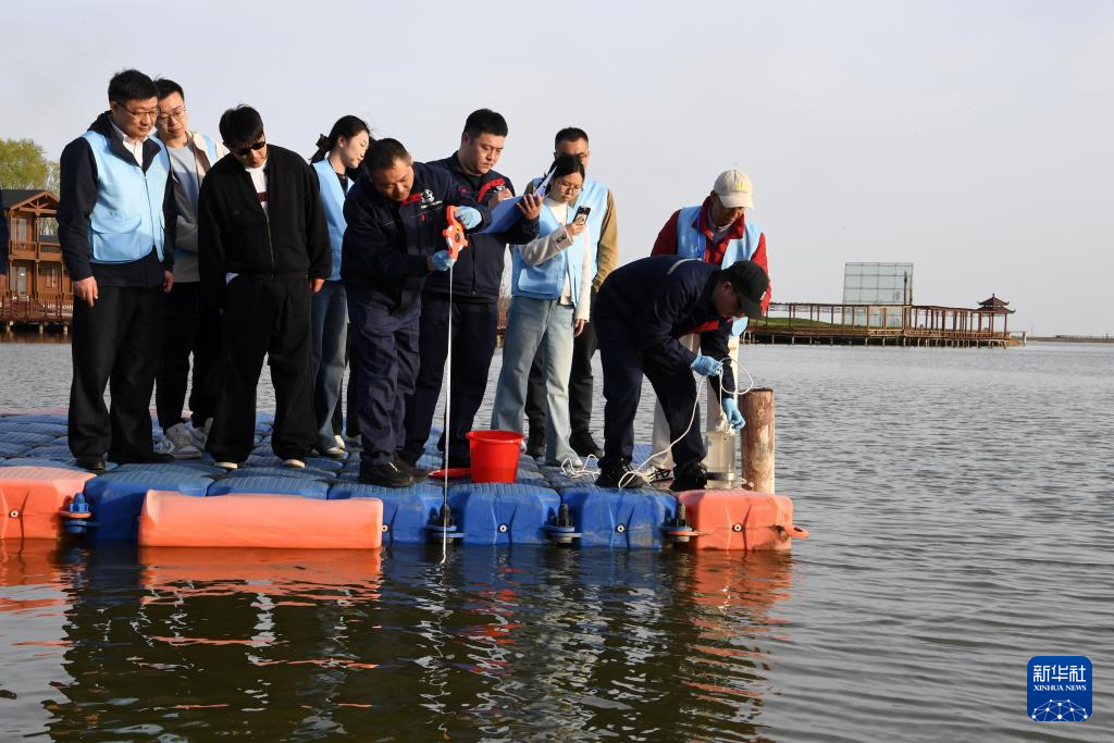 4月22日,在锦州大凌河口湿地,嘉宾观摩当地环保部门工作人员取样检测湿地水质。(新华社记者 马宁 摄)