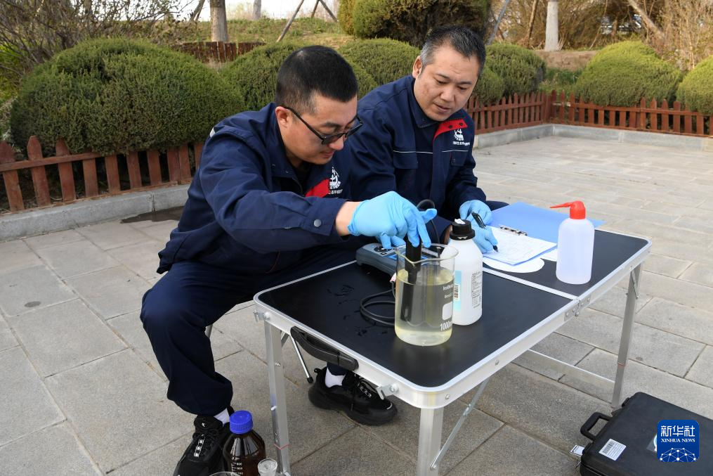 4月22日,在锦州大凌河口湿地,当地环保部门工作人员检测湿地水质。(新华社记者 马宁 摄)