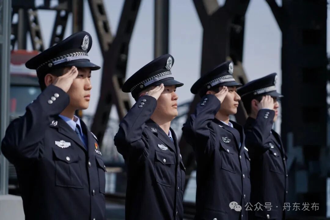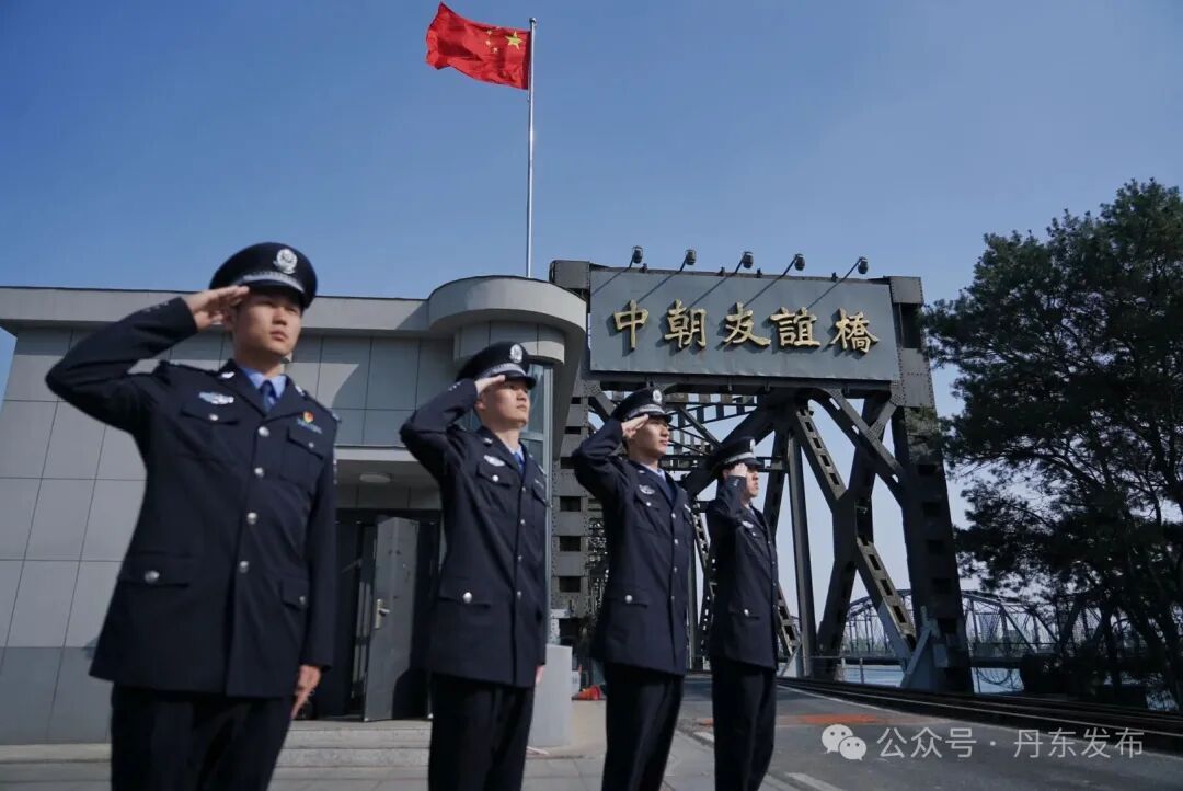在见证英雄出征的中朝友谊桥,丹东移民管理警察身着警服、庄严肃立,以标准军礼遥寄哀思,用坚守传承使命,告慰不朽忠魂。
