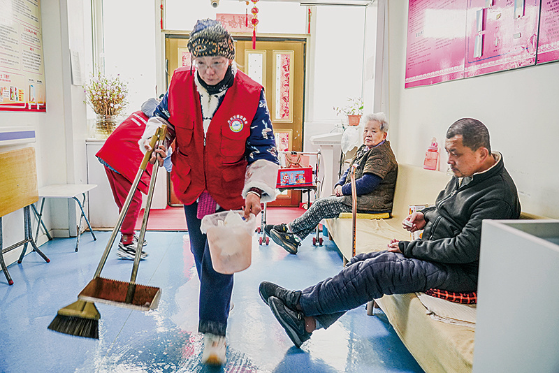 活动现场暖意融融,志愿者们分工明确,化身“暖心使者”为老人们提供全方位贴心服务。有的手持扫帚、抹布,细致清扫公寓公共区域,擦拭门窗桌椅,清理卫生死角,为老人们提供干净整洁的生活环境;有的专注为老人们理发,精准贴合老人们的需求,修剪出清爽利落的发型;有的蹲下身,轻柔地为老人们修剪指甲;还有的与老人们拉家常、话冷暖,耐心倾听他们的心声。