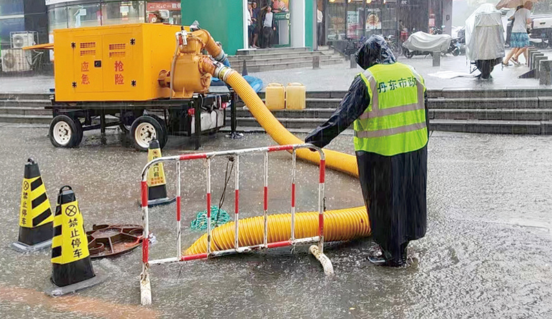 금산대가 화미과학기술청사 앞에서는 방류인원들이 펌프차를 리용하여 물을 퍼내면서 보행자와 차량들의 통행을 보장했다.