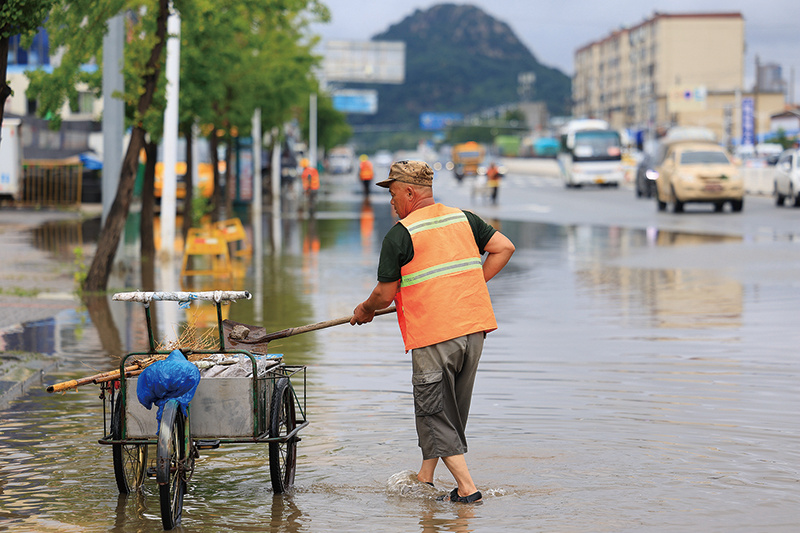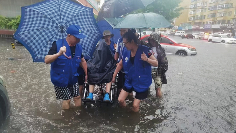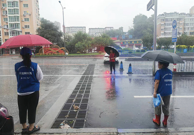 이날 폭우로 도로 곳곳에 물이 고였다. 원보구 홍교사회구역 인원들은 주민들이 안전하게 침수구간을 지나가도록 도와주었다.